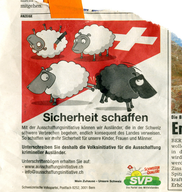 Im Februar 2014 beschloss die Schweiz in einer nationalen Abstimmung verschärfte Regeln für die Zuwanderung von Ausländern. Da ich selbst ja einige Jahre in Basel gearbeitet habe, überraschte mich das nicht: Rechtskonservative Parteien waren schon länger relativ stark gewesen. Als ich 2007 in der Schweiz ankam, lief zum Beispiel gerade eine Kampagne der SVP gegen „kriminelle Ausländer“. In der Zeitung konnte man damals solche Anzeigen entdecken: